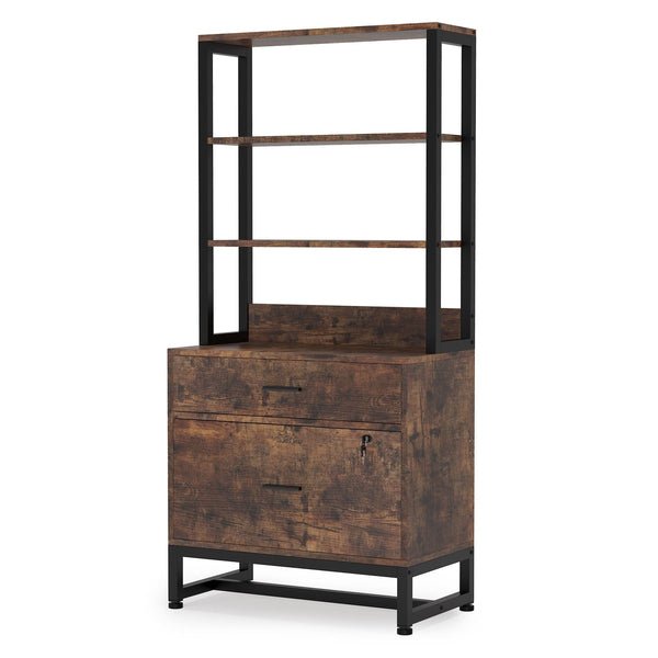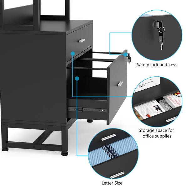 The top drawer neatly stashes office supplies and personal items, while the bottom drawer — equipped with a built-in hanging rod — securely holds letter-size files. A dedicated lock keeps important documents protected.